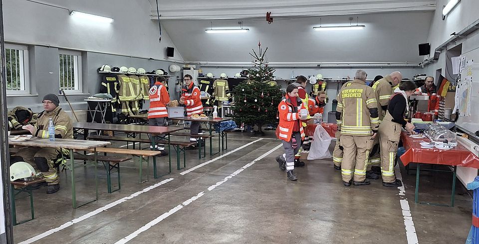 Am 30.11. gingen die Melder des Betreuungsdienstes der Einsatzeinheit 04 bereits um 8.40 Uhr auf. Etwas ungläubig schauten wir auf unsere Alarmnachricht, war doch heute der 1. Advent. In Burscheid brennt ein großes Haus, es ist Frühstück für 60 Einsatzkräfte angefordert. 100 Brötchen konnten wir an der Tankstelle ordern, Aufschnitt hatten wir vorgehalten. Nach 20 Minuten konnten wir uns " aus" melden und eine halbe Stunde später wurde die Frühstücksausgabe aufgebaut und die Einsatzkräfte vor Ort konnten frühstücken. Wenig später kam die Nachforderung: 60 Portionen Warmverpflegung. Da unsere Feldköchin wie fast immer in Rösrath am Standort verbleibt, konnte ein leckerer Gulascheintopf bereits um 11.45 Uhr, also 35 Minuten nach Anforderung für 60 Einsatzkräfte abholbereit gemeldet werden. Gegen 17.30 Uhr konnten die Einsatzkräfte der Einsatzeinheit abrücken nach Rösrath. Eine Einsatznachbesprechung folgte, dann hieß es" Einsatzbereitschaft herstellen", Fahrzeuge entladen, aufräumen, nachfüllen. Nach dem Einsatz ist vor dem Einsatz und der konnte ja rasch folgen.