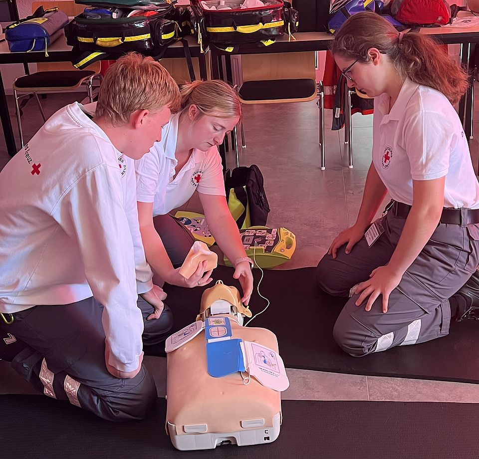 Bereits um 9.00 Uhr begann am 06.September die Ausbildung zum Sanitäter in Bergisch Gladbach in den Räumlichkeiten des DRK Kreisverbandes. 4 Azubis aus dem Ortsverein Overath, ein Auszubildender aus Bergisch Gladbach und 4 Azubis aus dem Ortsverein Rösrath erwartete ein spannendes Wochenende. Nach der Einführung am Samstag wurde am Sonntag sogleich mit der Reanimation begonnen. Ansprechen, anfassen, Atemkontrolle- keine Atmung mehr- Reanimation. Aber damit nicht genug. Auch das Anlegen des AED Gerätes, die Vorbereitung zur Absaugung und die Benutzung der Laryngsmaske wurden so lange trainiert, bis jeder Handgriff sicher war. Die Ausbilderin Kristina Hübinger überwachte die Maßnahmen sehr intensiv, denn die Reanimation wird am Ende fehlerfrei in der Prüfung erwartet. Weitere 9 Wochenenden werden folgen, an denen weitere lebensrettende Maßnahmen vermittelt werden.